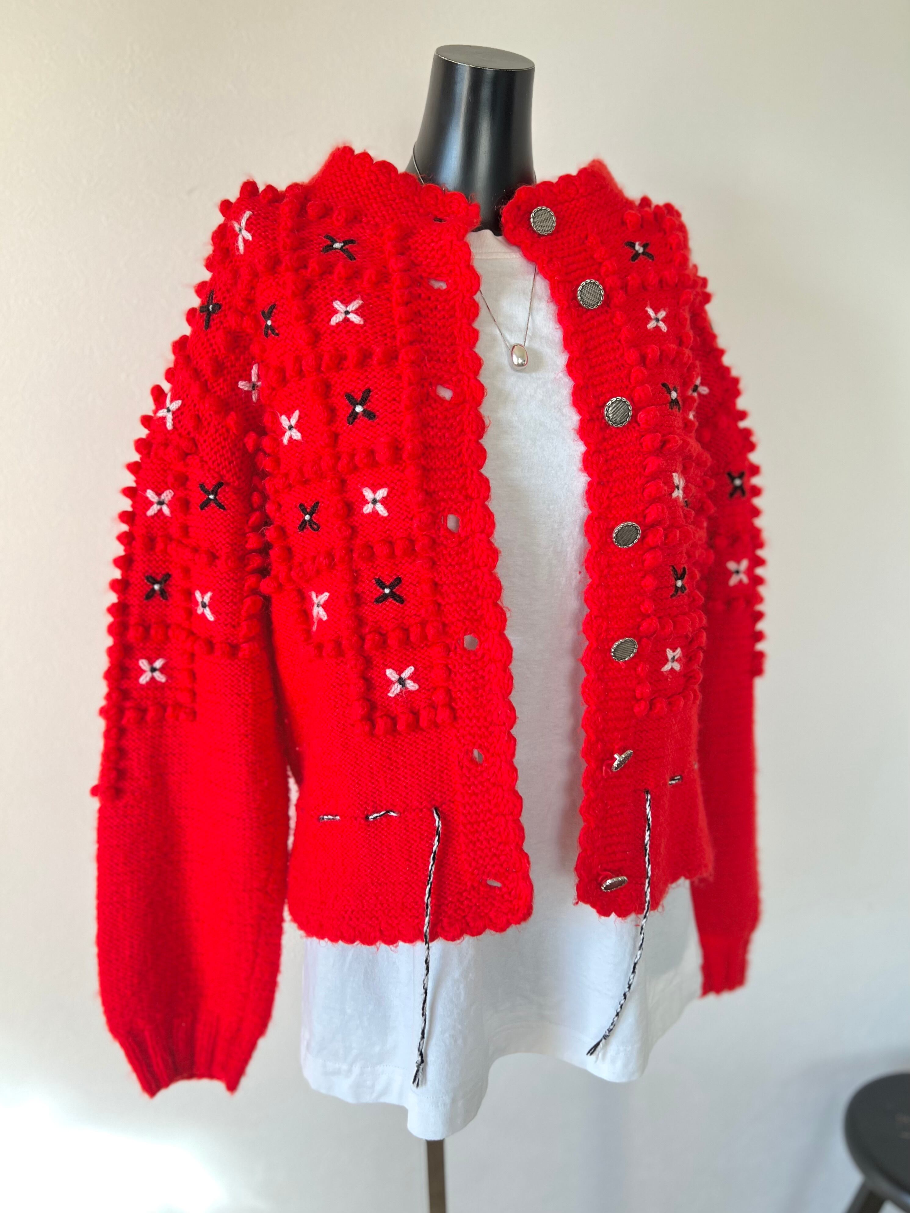 ポッポコーン編みに花柄が刺繍されたヴィンテージハンドニットならではの魅力の詰まったニットカーディガン。