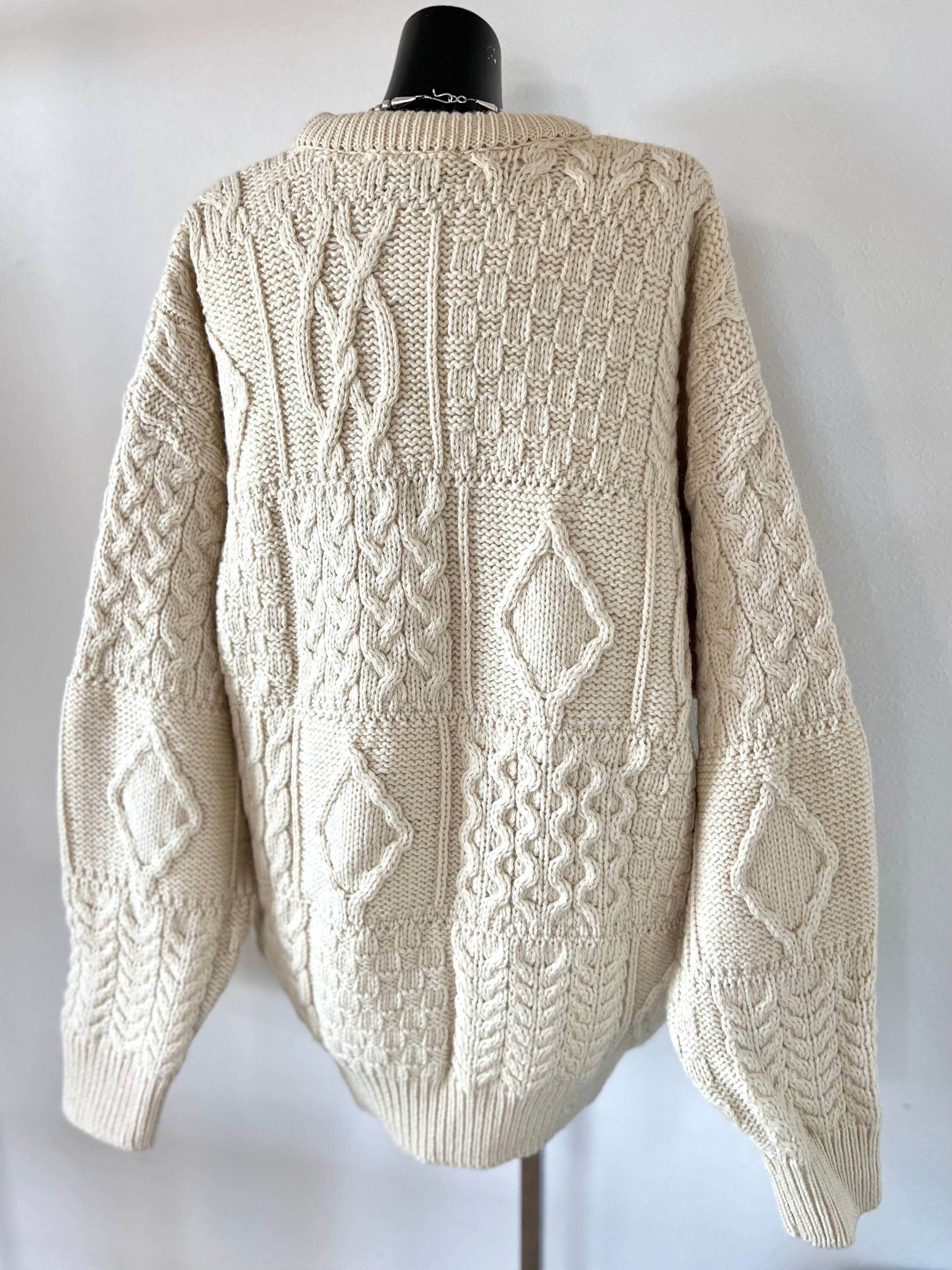 伝統的なアランニットをパッチワーク編みにしたオーバーサイズのニット 。