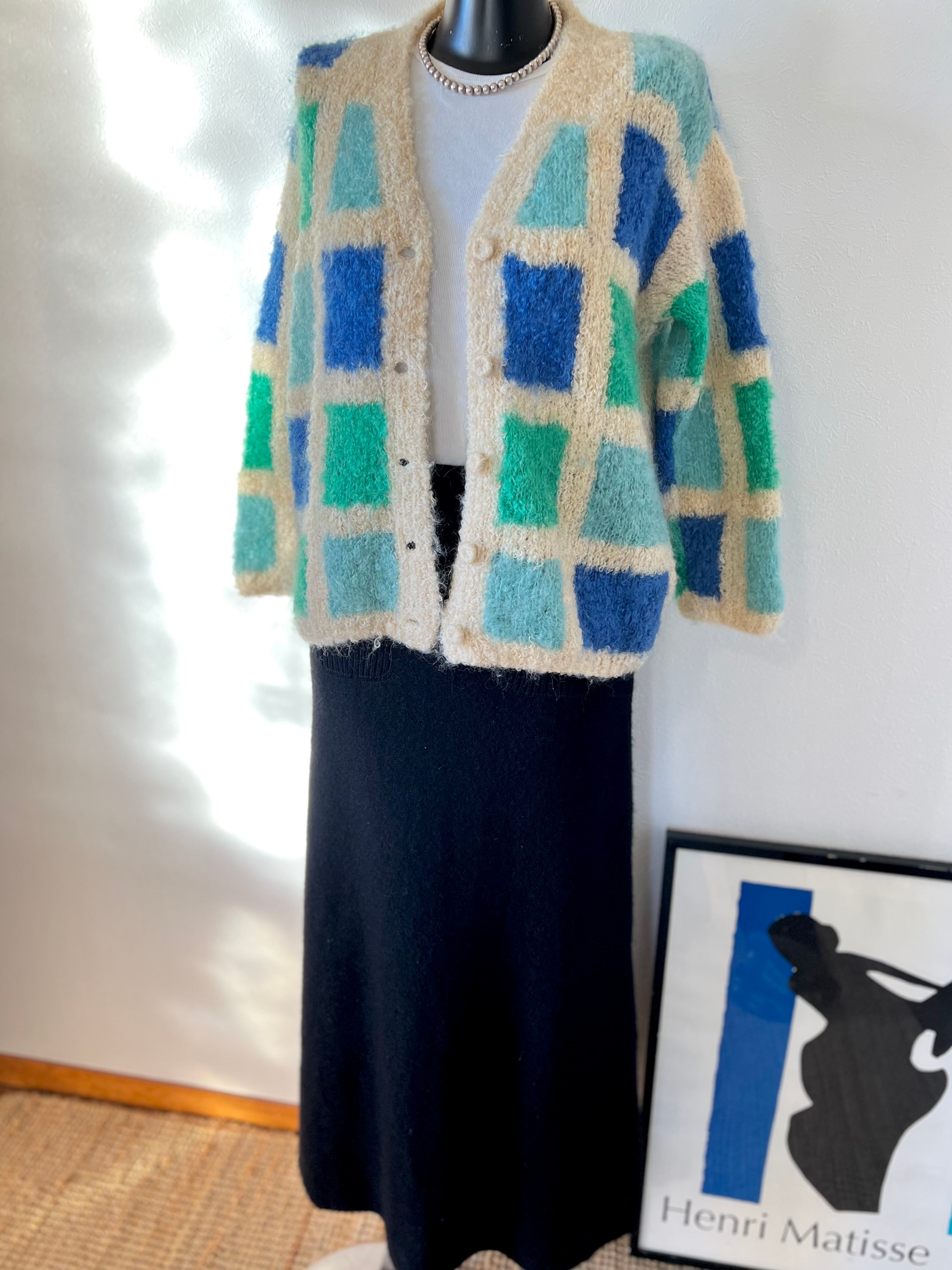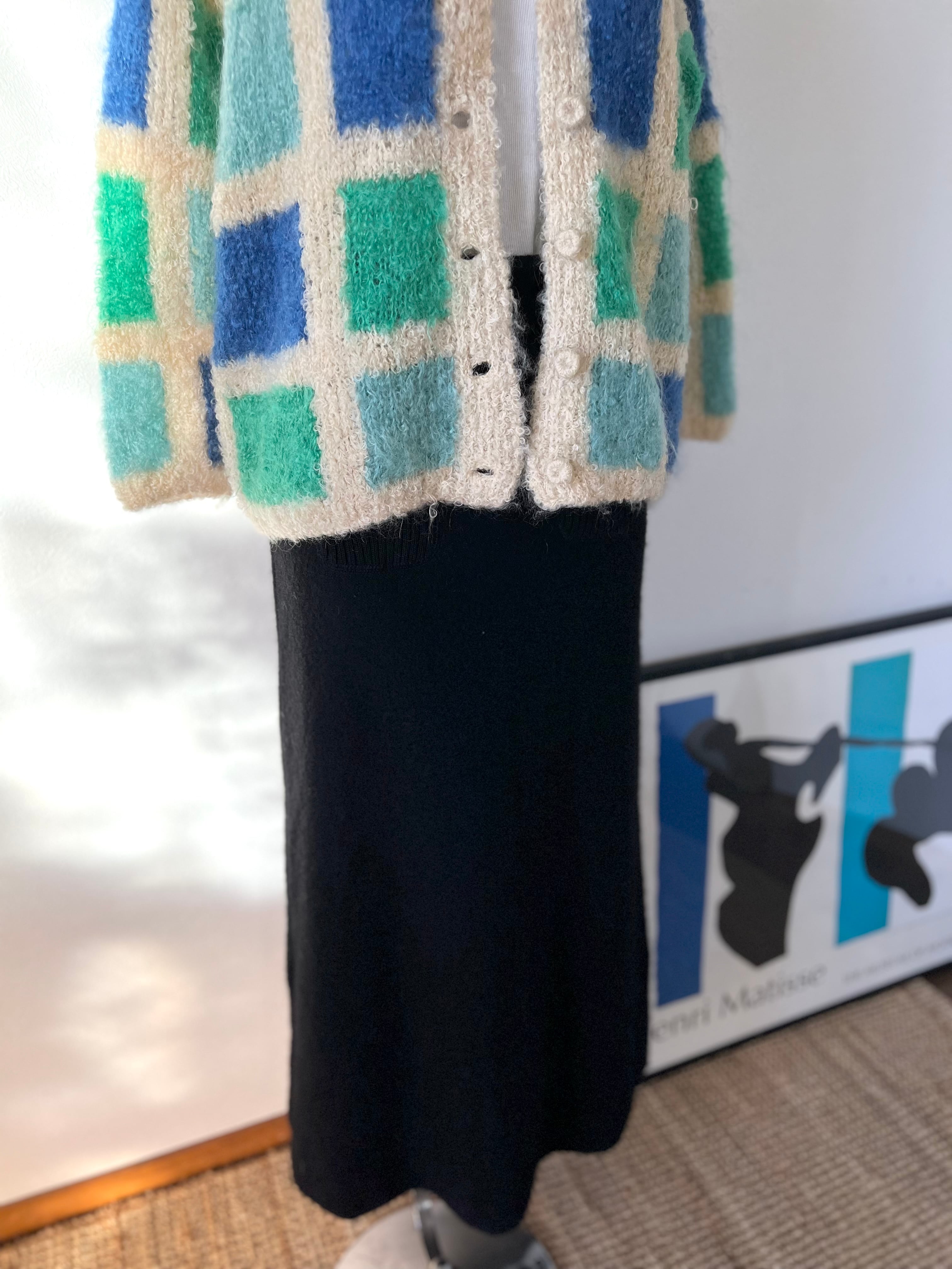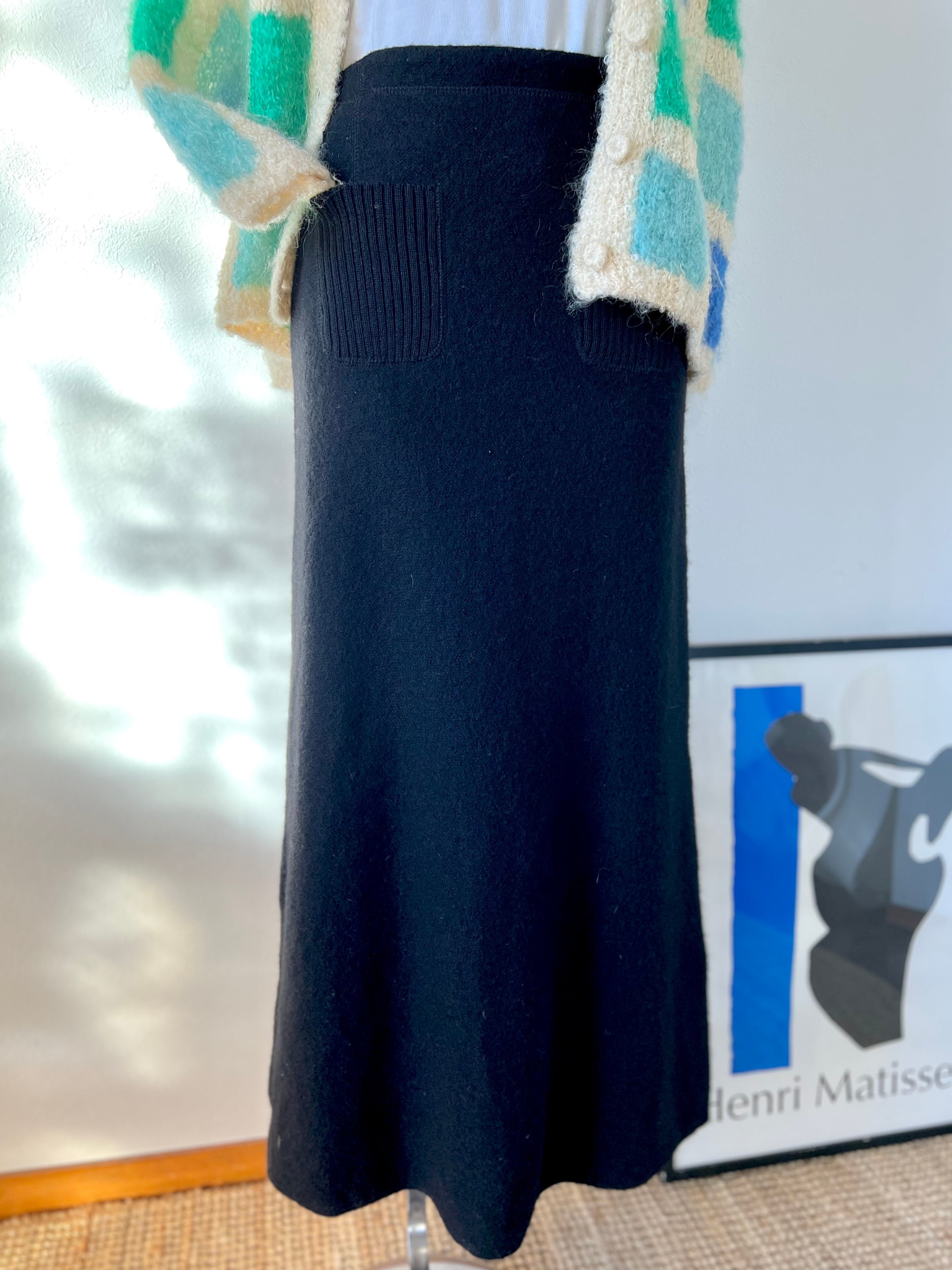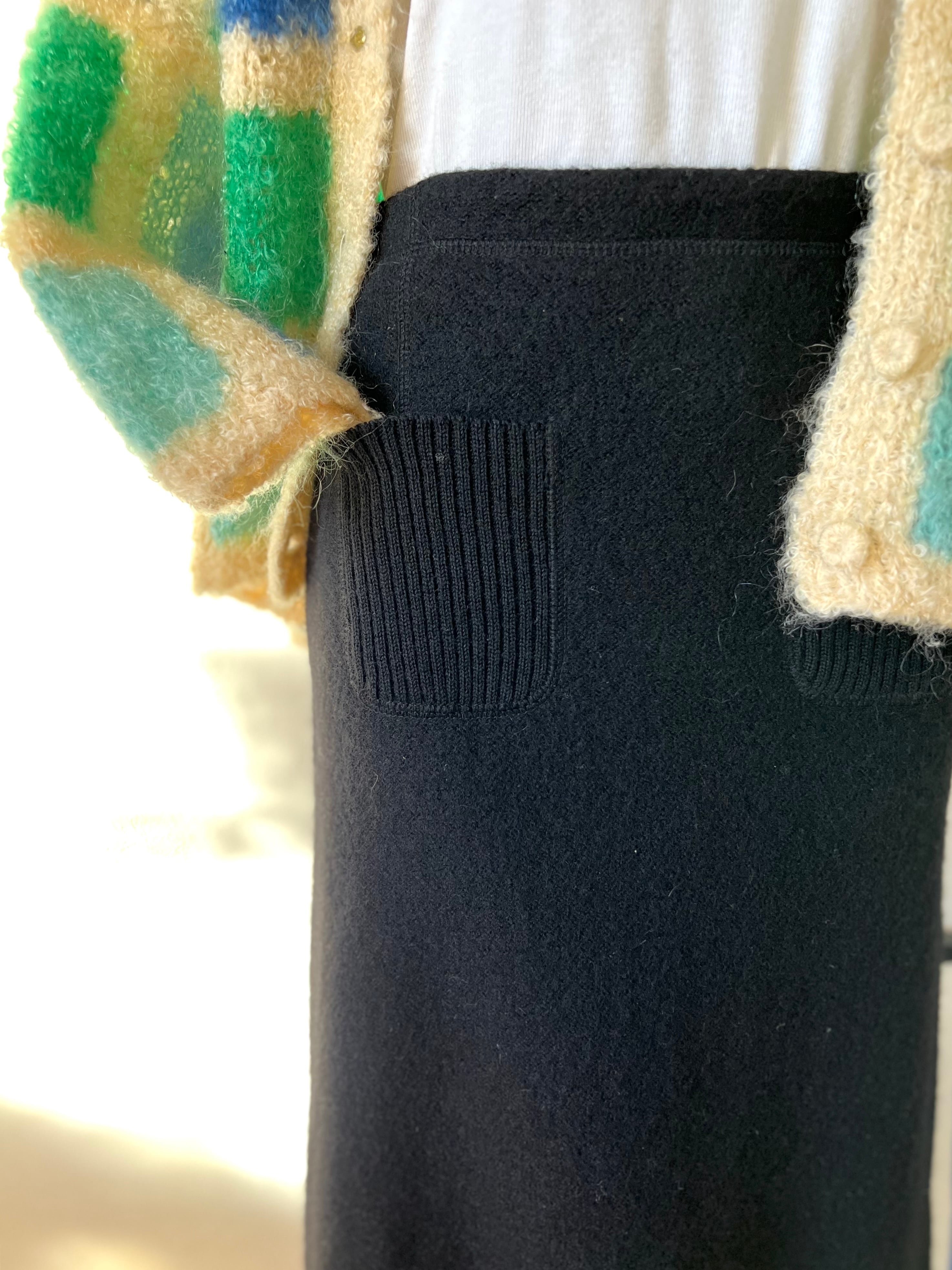 伸縮性と温かみのある圧縮ウールと思われる冬らしいテキスタイルが可愛いマキシスカート。