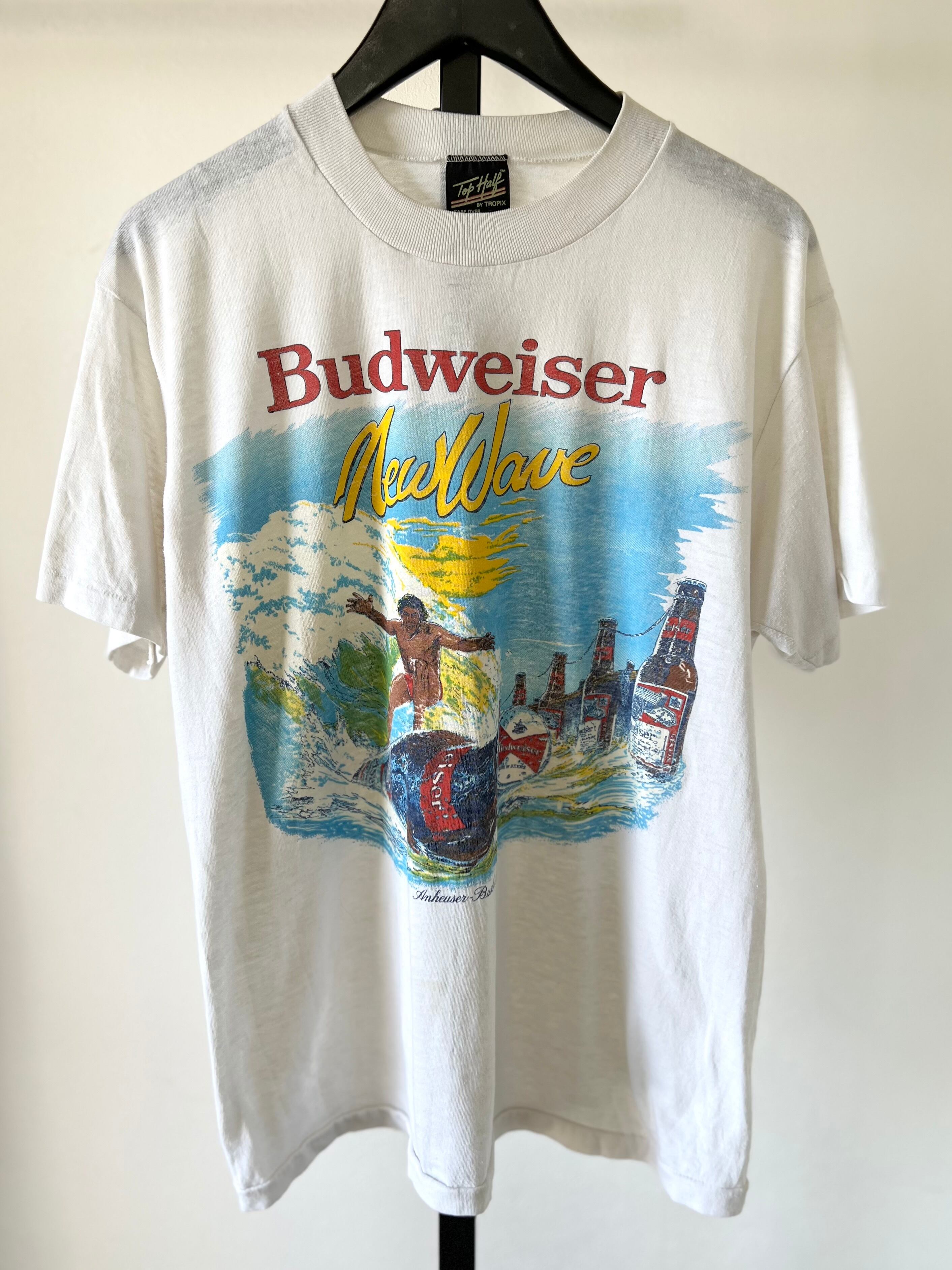 バドワイザーをサーフィンボートに見立てたヴィンテージならではの愛らしいプリントのTシャツ。