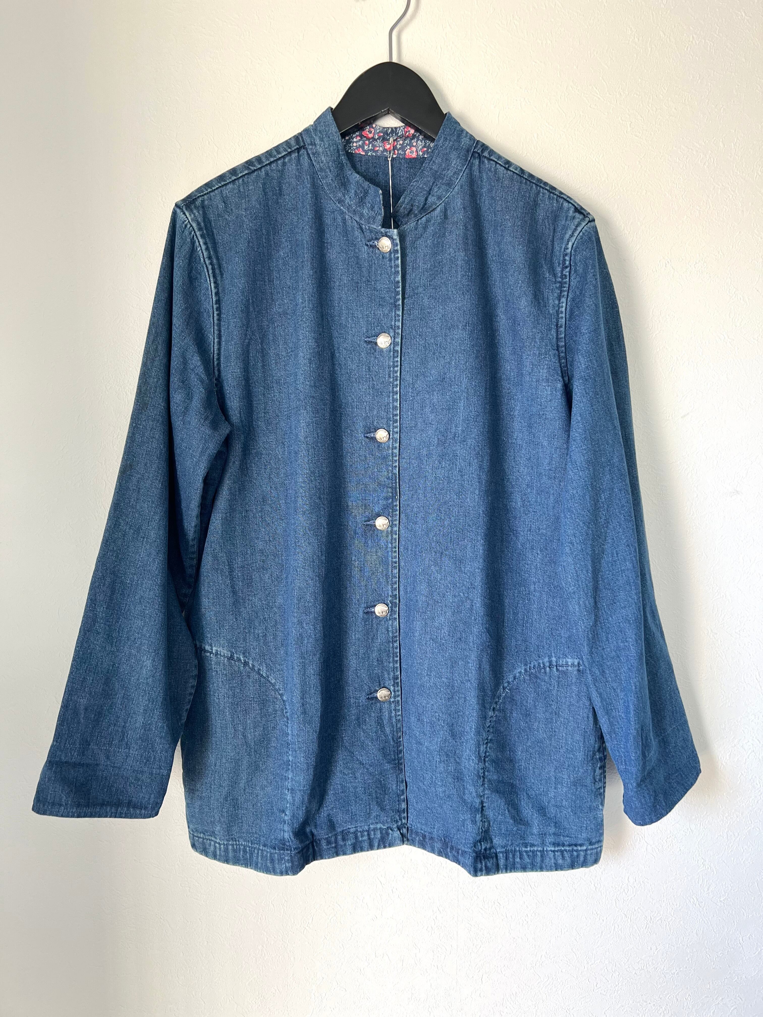 襟と袖裏の裏地が花柄になった90年代のチャイナスタイルデニムジャケット。