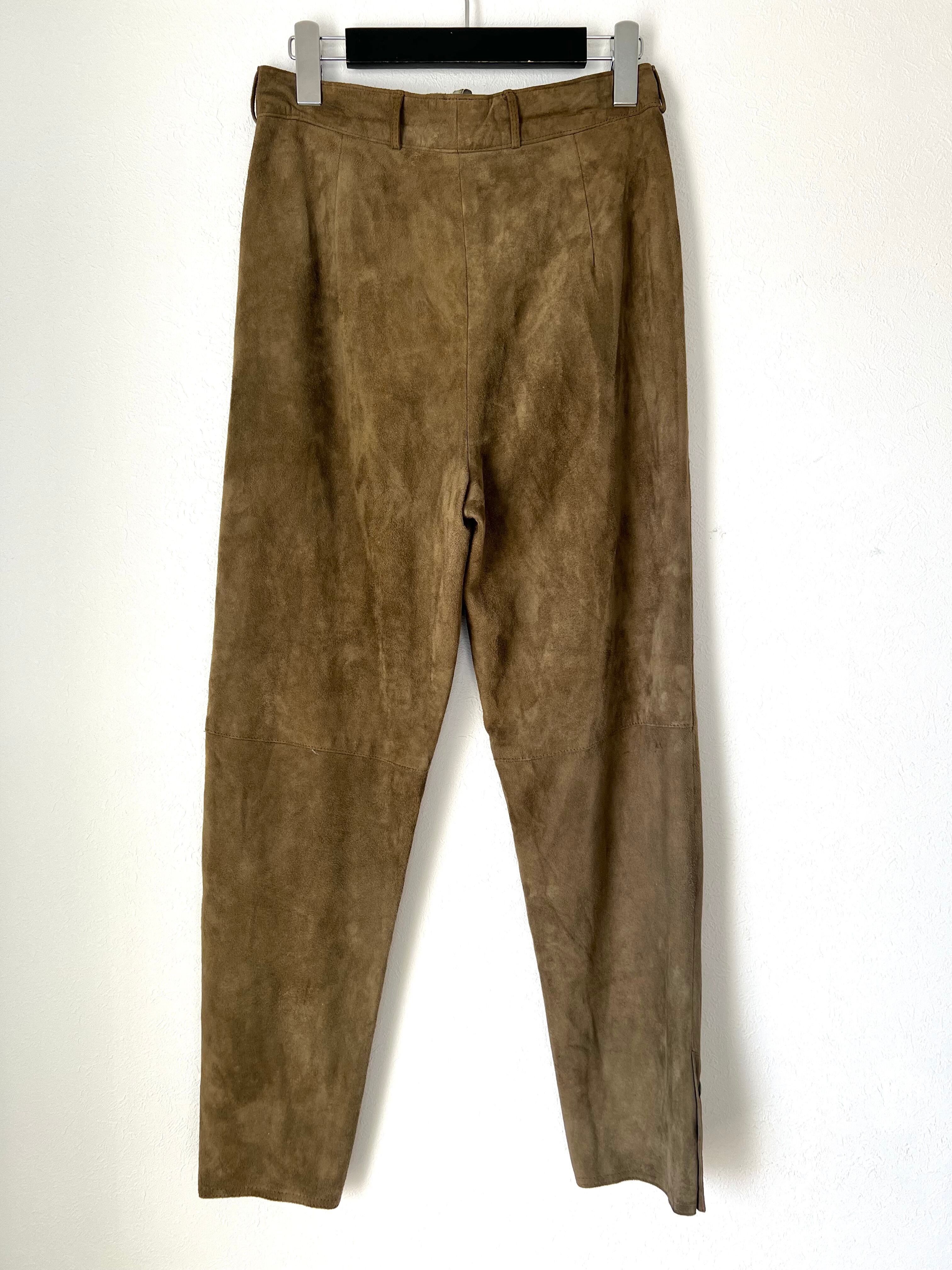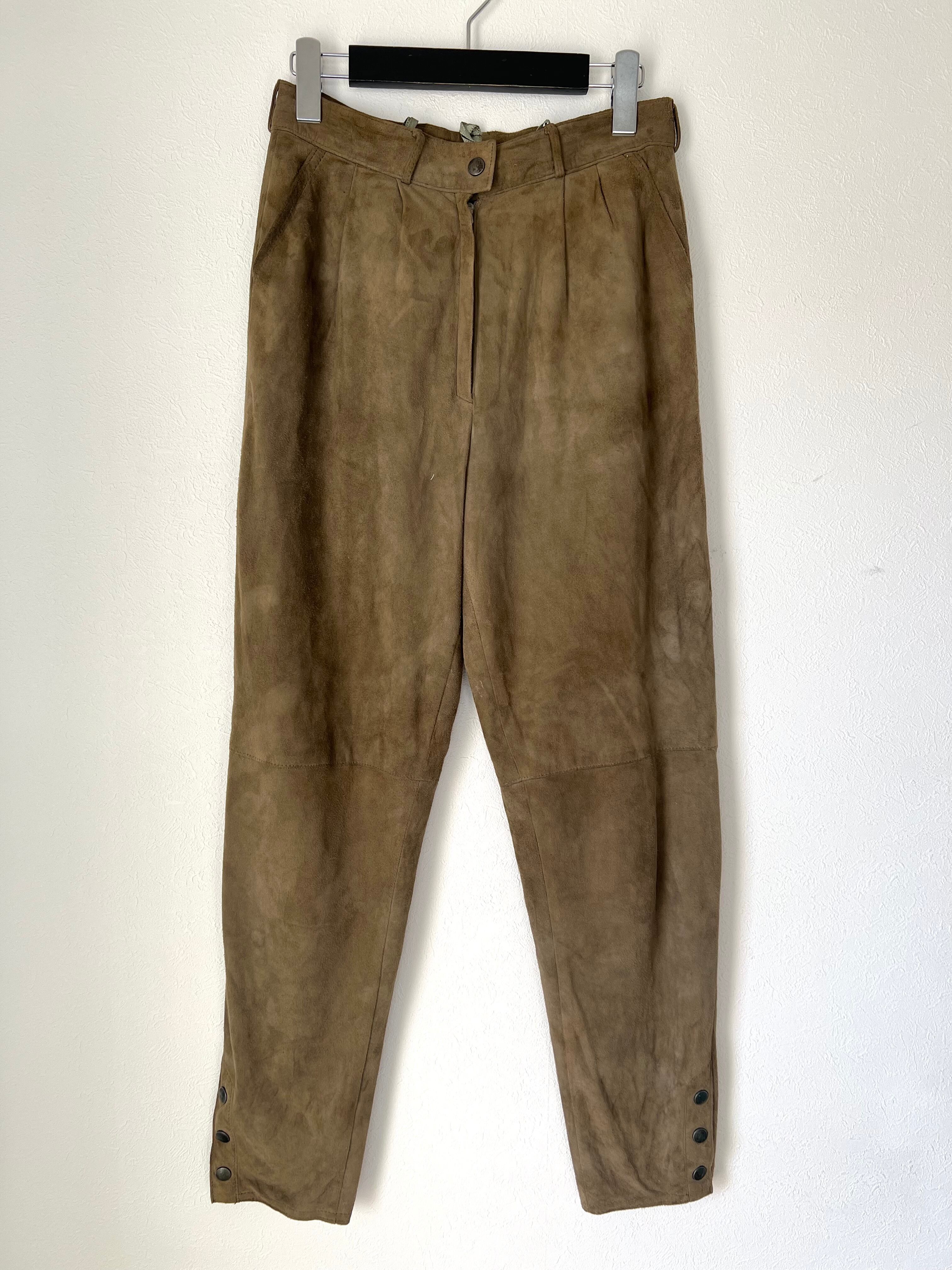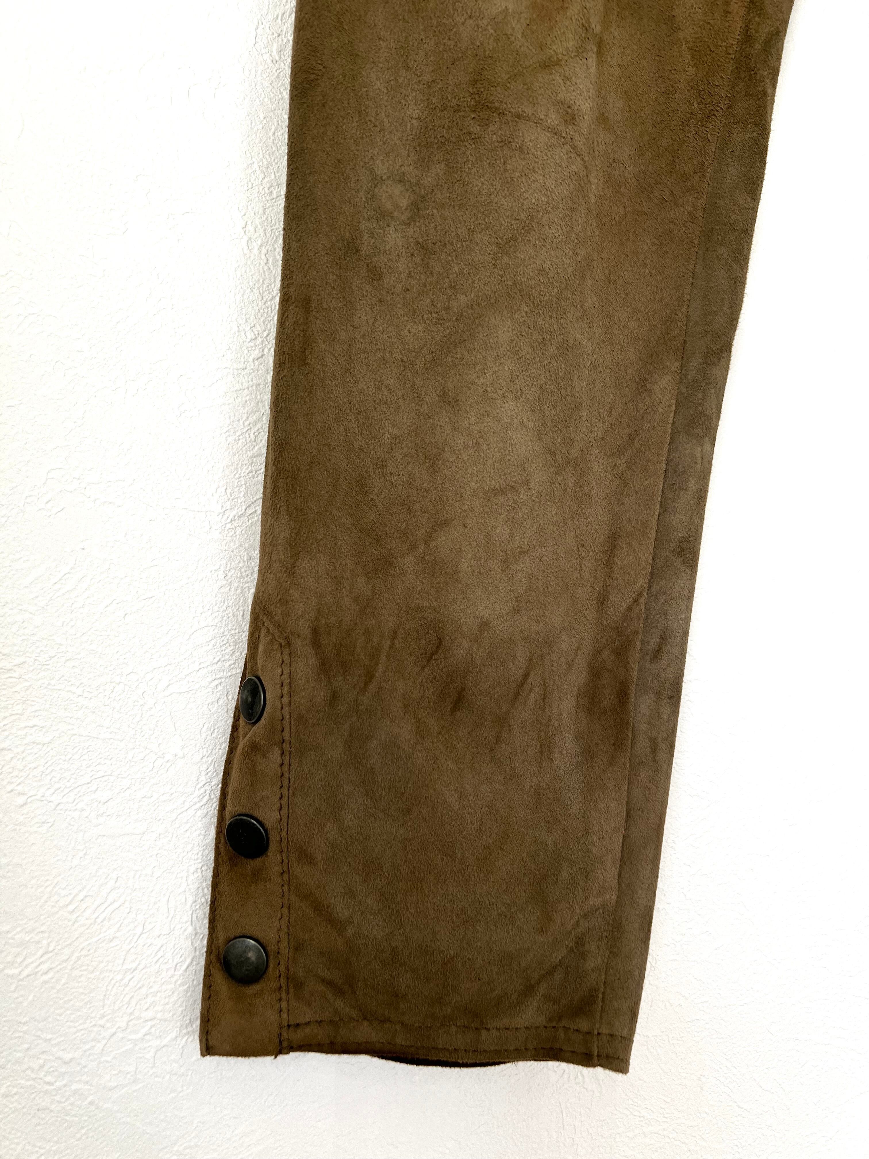 裾サイドがスナップボタンのスリットになったスエードレザーパンツ。
