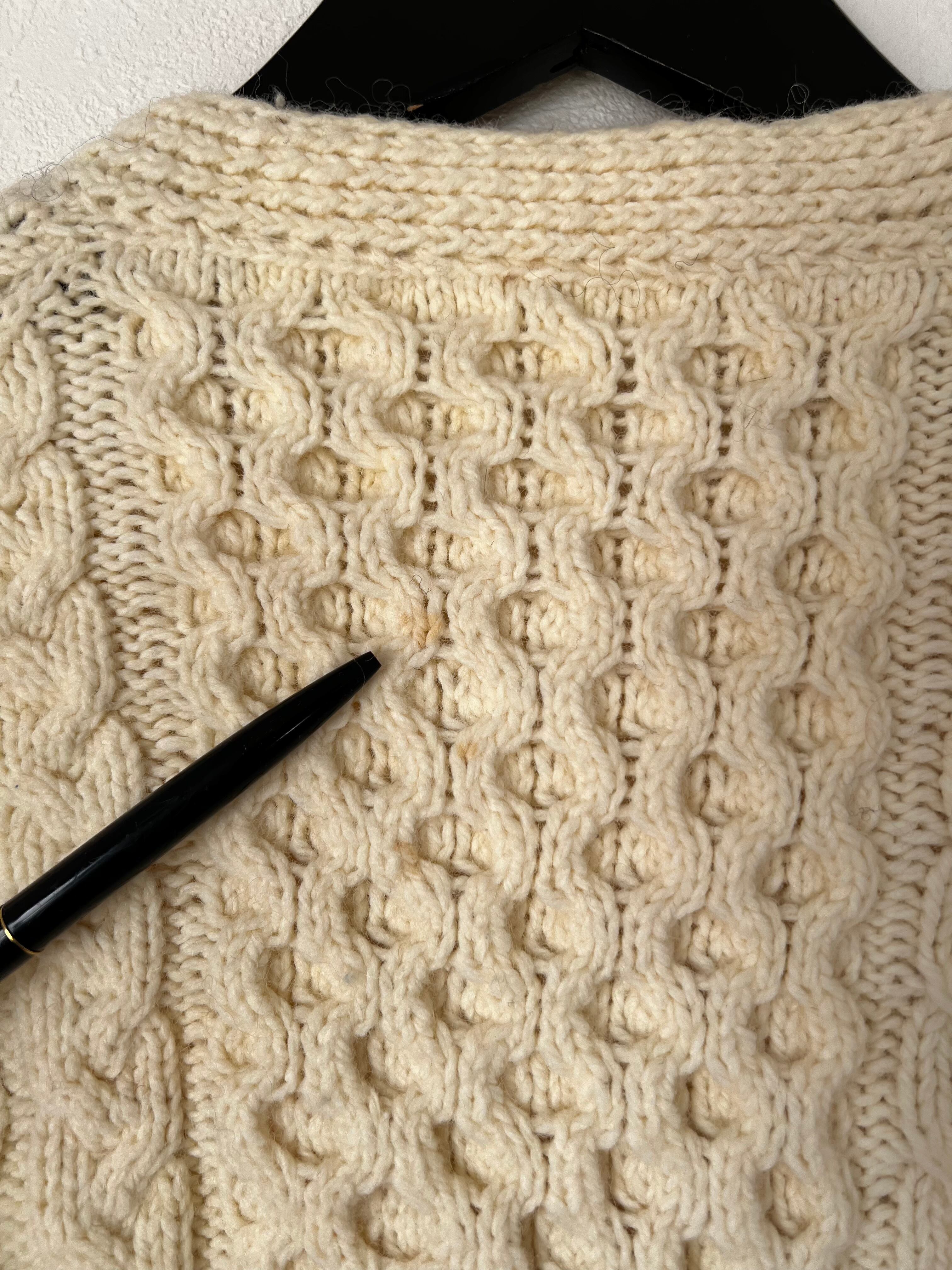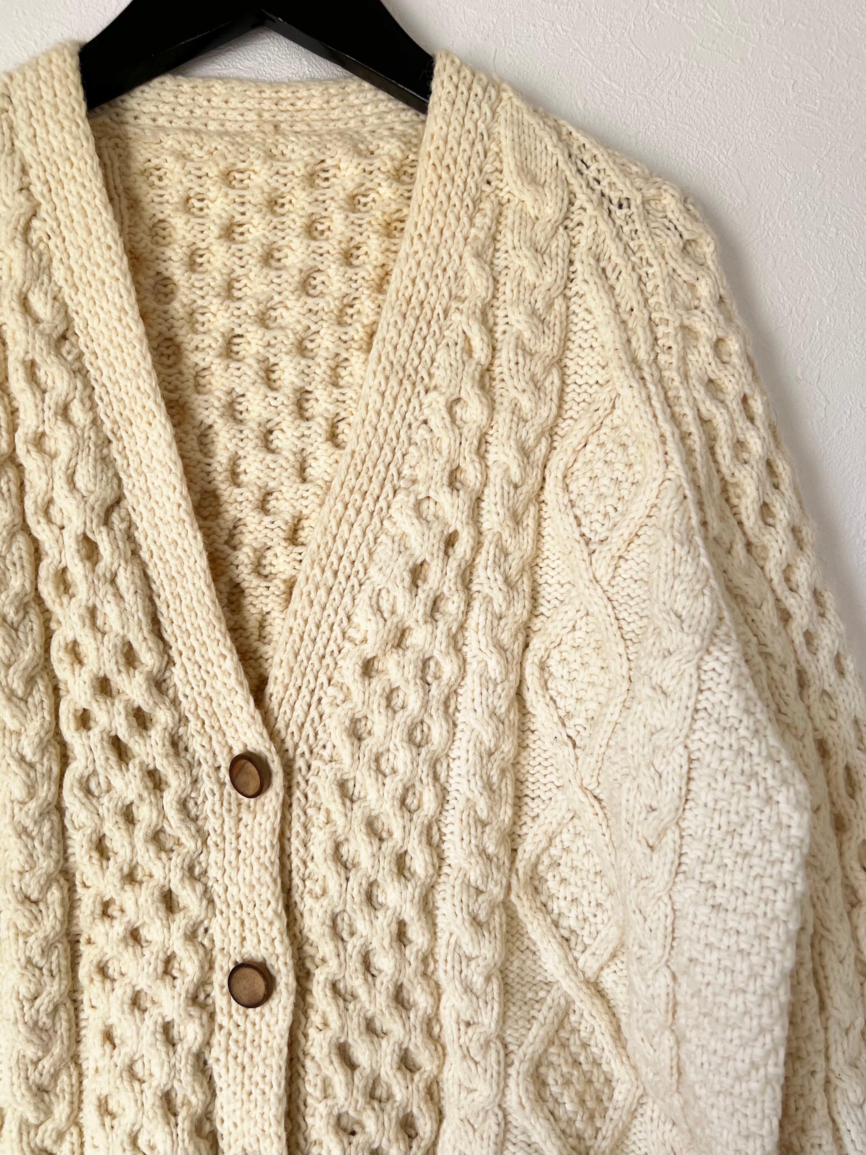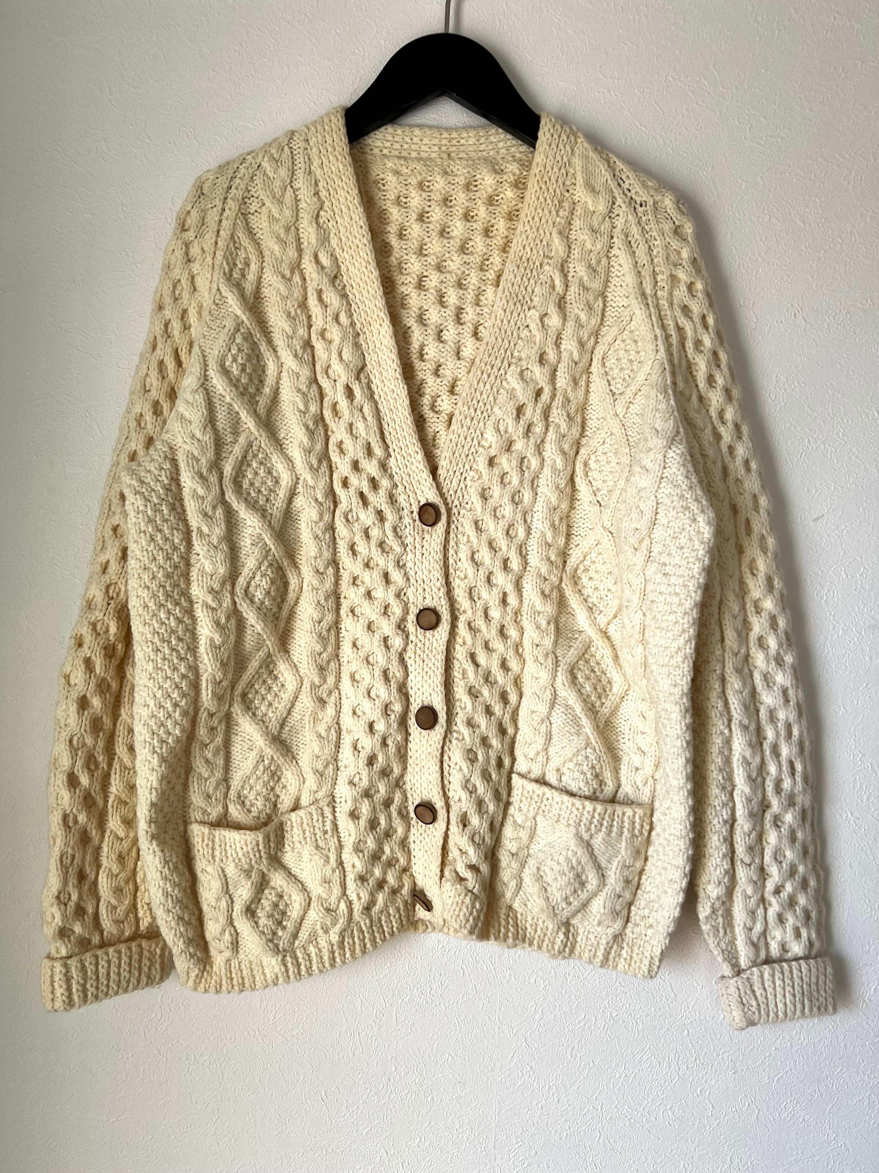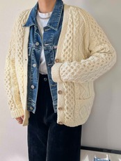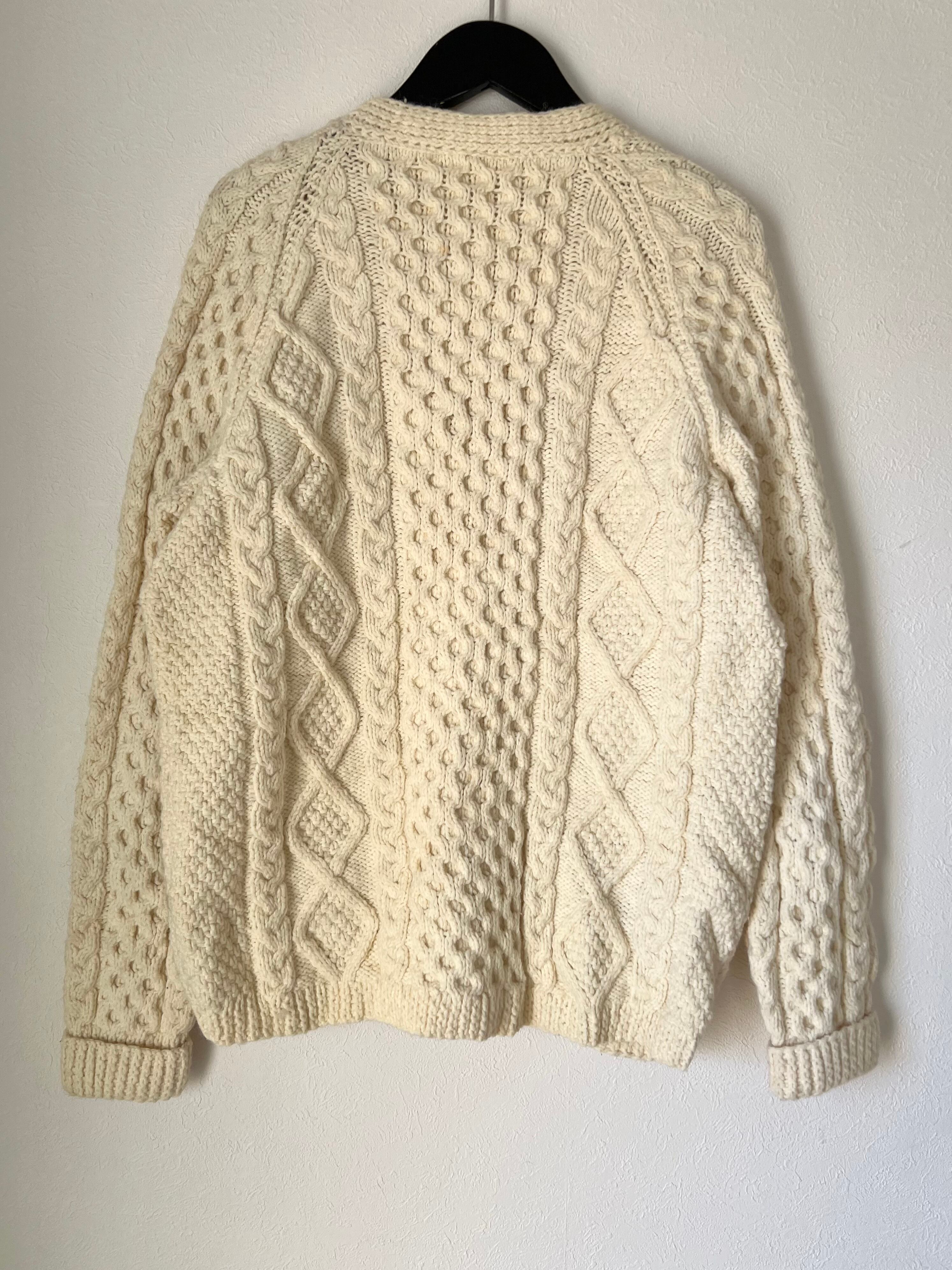 ウッドボタンのクラシカルなフィッシャーマンニットカーディガン。